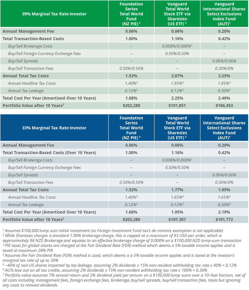 When it comes total all-in costs on an after-tax basis, the Foundation Series Total World Fund (which wraps up the same underlying Vanguard Total World Stock ETF within a tax-efficient PIE vehicle) offers the lowest total cost to investors when both tax and fees are taken into account.
